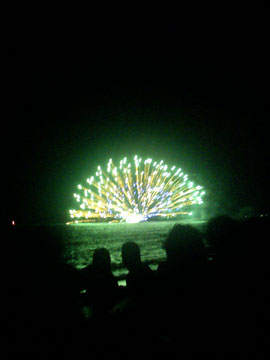 館山の花火8月8日館山の花火を見に行くことにした。 千葉駅のロータリーで待ち合わせて、車で開通したばかりの 館山道を走っていった。 途中からは片側一車線で車線の幅も狭くあまりスピードも出せない。 道の駅のようなパーキングのようなところで豚角煮チマキなどを食べ、 高速を降りて館山市外に近づいたところで渋滞に巻き込まれてしまった。 花火の会場まではかなり遠いけど仕方なく空き地に車を停めて歩いて行く事にした。 2、30分歩いてようやく会場の浜に到着して空いている場所にシートをしいて、 前に来たときに買ったじゃがバターを買いに行った。 ペットボトルのコーラと、じゃかバターを買うのに行列で、けっこう時間がかかり、 もうすぐ買えるというところで花火が始まった。 シートのところにもどりじゃがバターを食べながら花火を見た。 途中から海上花火も上がった。他では見たことのない花火で海の上に 放射状の花火が上がる。音が大きくどっかんどっかん体に響いてくる。 浜ではフラメンコの踊りをやっていた。 終わった後イオンのショッピングモールをぶらぶら歩いた。 ここはできたばかりのようで、新しくきれいだった。 帰りの高速では暴走族のようなやつらが前で蛇行運転なんかしていて、 一車線なので抜くこともできず邪魔だった。 |