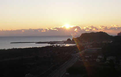初日の出1月1日前日からレンタカーを借り、グランビュー一ノ宮という、 部屋だけ貸すホテルに泊って初日の出を見た。連れも自分も風邪で体調が 悪かったけど、部屋の窓から見られるので、それほど寒い思いもしないで 初日の出が見られた。天気がよかったのですごく明るく眩しかった。 |
