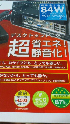 acアダプタ電源8月13日foxconnのatomベアボーンを使ったサーバーの電源ファンがちょっとうるさいのでabeeのACアダプター式電源AC84-AP03AAに変えてみた。 元の電源を取り外してこいつを代わりにつないで、コンセントを差して起動してみると普通に起動した。 音はほとんど聞こえないくらいのレベルになった。ケースファンが一つ回っているけど超低速回転なのでとても静かだ。 ATX用の変換ブラケットがついているけど使えないので、abeeのサイトでFTX用のブラケットを注文した。 電源変換効率も87%と非常に高いので電気代も少しは安くなるはずだ。 |