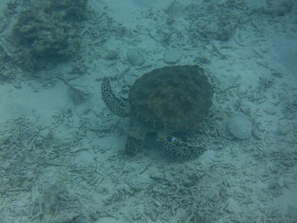 子亀9月5日朝食後に一度海に入ろうと思いシュノーケルだけ持ってホテルの前のとかしくビーチへ行った。 ほとんど人のいない海は余計に澄んで見えた。 砂も真っ白で別世界のような美しさ。 昨日見た真っ白な魚や大きな魚はいたけど海亀は見当たらなかった。 しばらくすると妻が来て一緒に沖に泳いでいった。 今日は海亀はいそうにないと思っていると妻が見つけたらしく手招きで僕を呼んだ。 泳いで近づくと昨日よりさらに小型の子亀が餌をついばんでいた。 急いでデジカメをとりだし写真と動画を撮った。 しばらくすると子亀は浮上して妻の目の前に浮かび上がった。 レンタカーを借りにいかなければならないので、部屋に戻って 着替え、ロビーで送迎を待った。 |