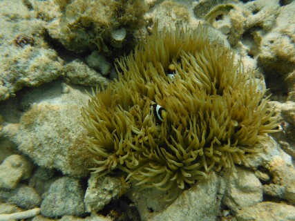 カクレクマノミ9月5日レンタカーを借りてホテルに戻りフロントで鍵をもらおうと思ったらないと言われたので妻が部屋に戻ったのだと思い部屋をノックしても反応がない。 妻に電話しても出ないのでしばらく待ってもう一度ノックすると今度は出てきた。 シャワーでも浴びていたらしい。 レンタカーで島内をぐるぐるまわり港の歴史民族資料館を見ようと思い行ってみると休業中でとなりの食堂でカツカレーとソーキそばを食べた。 食べた後ウン島の方へ行くことにして島の南端の駐車場まで車を走らせた。 ここは3年前にも来た場所でちょっと懐かしかった。 3年前には東側のビーチで泳いだので今回は西側のビーチに降りビーチハウスを設置。 着替えて海に入ると浅くて珊瑚もなく魚は少ない。 ちょっとがっかりしていると着替えに時間がかかっていた妻も着替え終わり一緒に泳いだ。 浅瀬で立ち上がり何気なく回りを見るといそぎんちゃくが見えた。 水中眼鏡で除くと隙間にオレンジ色の小さな魚が見えた。 もしかしてと思いよく見るとやっぱりカクレクマノミだった。 まさかそんな場所にいると思わない浅瀬の小さないそぎんちゃくの中にいたのでちょっと感激してしまった。 予想以上に小さく他のクマノミとは全然違う。 カップルらしく2ひきいて、イソギンチャクの隙間に一生懸命隠れようとしている。 何枚か写真と動画を撮り満足してその場を去り、他の場所でしばらく泳いだ。 最後にもう一度カクレクマノミを見ようと探したけどなぜか見つからなかった。 時間がないのであきらめて、着替えてビーチハウスを片付け車に乗り港の近くの農協の店へ行き飲み物やお菓子を買い込みホテルに戻った。 |