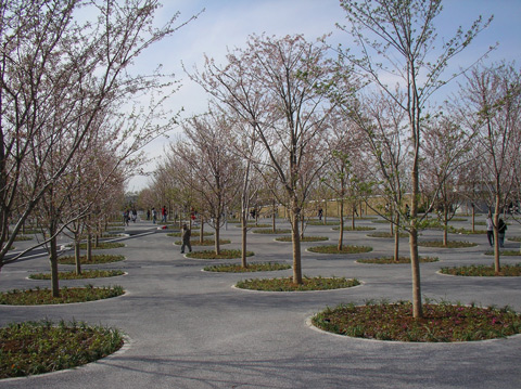 さくら広場4月9日今日開園した建築家の安藤忠雄氏が設計したという「さくら広場」に行ってみた。 入り口には警備員がいて入場の際に番号札を渡され、帰りに返すというシステムで、 ちょっと物々しい感じだ。 お花見気分でお弁当など持って行ったら飲食禁止だという。 とりあえず中に入ってみたもののお弁当を食べたかったので、外に出て公園を探すうちに幕張駅の近くまで来てしまったので、もう戻るのはやめてしまった。 桜のほうもまだ2,3分咲き程度で満開になるのは何日か先のようだ。 5年後10年後に成長した桜が満開になった時、この広場ははじめて完成するんだろう。 桜の花が充満した世界というのがどんなものか、はたしてそれまで松下電器はこの施設を維持管理できるんだろうかと考えてしまう。 まあこういうものができるというのもちょっとバブル的な思考で、世の中変わってきた なと思う。 |