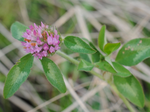 シロツメクサに似るが名前の通り花が赤い。 シロツメクサより若干大型で、葉は細長い。