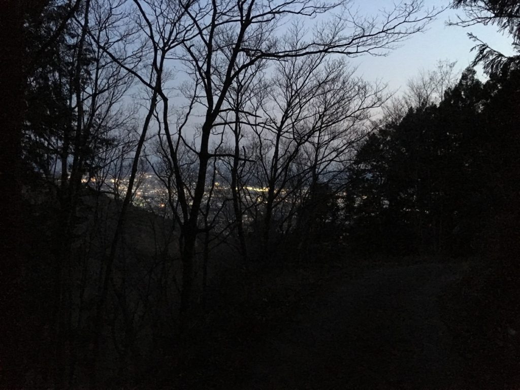 長い下りを疲れた足で走り続け、暗くて足元が見にくくなったころようやく林道に出た。