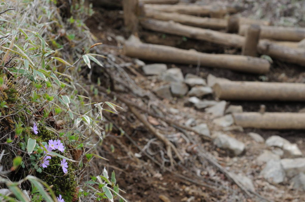 斜面の下に見えるのはオオカメノキの花だろう。