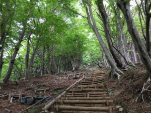 だいぶ標高が下がりガスが晴れてきたころには暗くなり雨が降って来た。幸い雨は木の葉の屋根に防がれほとんど下まで来ない。