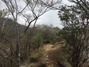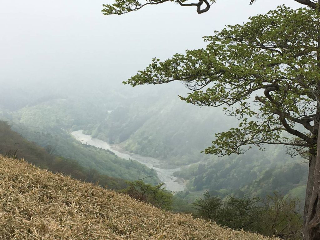 ガスが晴れると遠くの谷が見える。