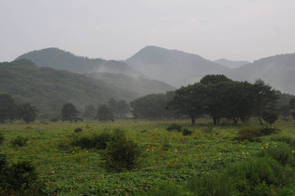 雨もあがり霞の中に咲くユウスゲと榛名山の山々の景色はなんとも言えない幻想的な美しさだった。