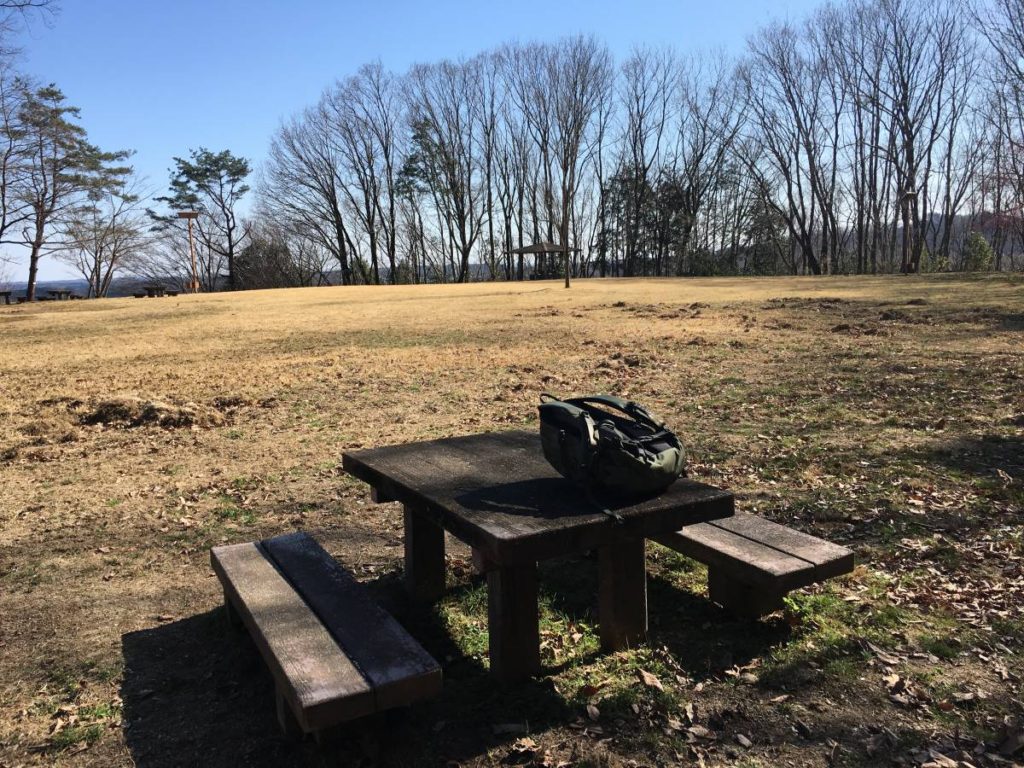 住宅地の近くの広い公園で昼食のおにぎりを食べた。