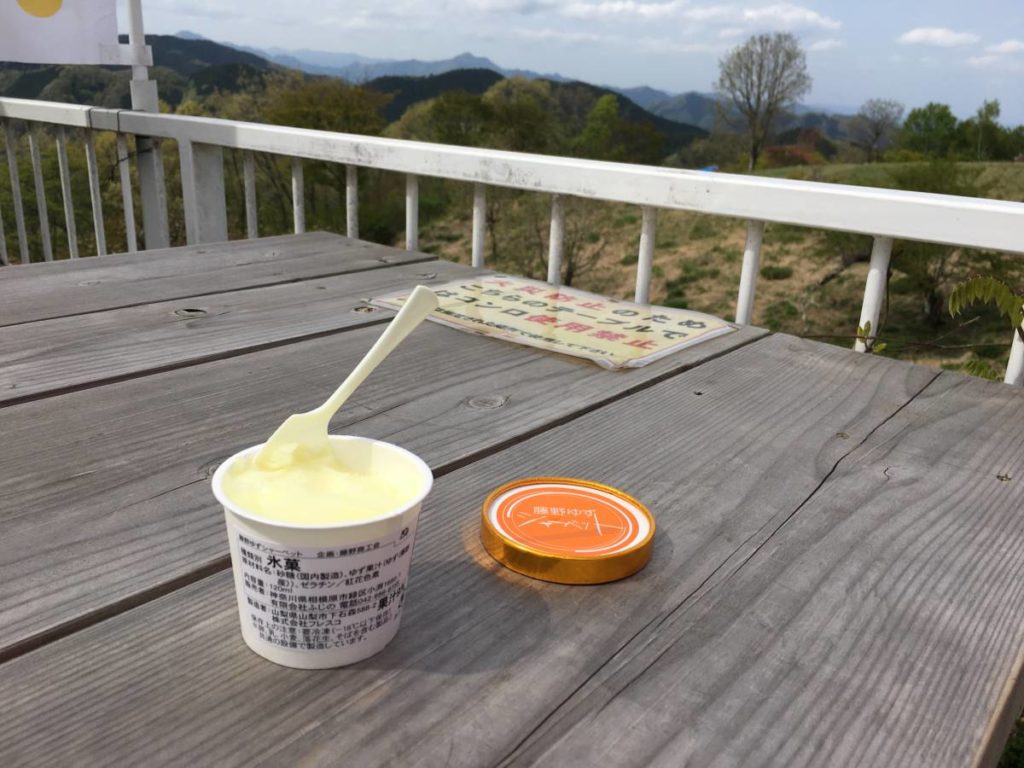 山頂のベンチでおにぎりを食べた後、藤野名物の柚子のシャーベットを食べた。