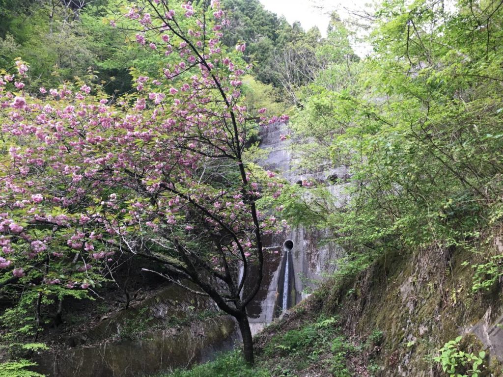 砂防ダムの下には八重桜がきれいに咲いていた。