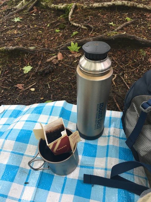水筒のお湯とパックのドリップコーヒーでコーヒーを入れて飲み、おむすびを食べた。