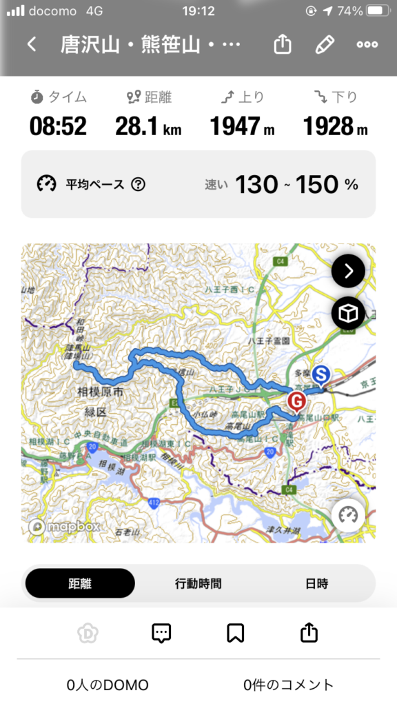 高尾山口駅の前の水道でどろどろの足と靴を洗い、トイレで着替えて帰った。YAMAPでの距離は28キロ。時間は9時間かかった。