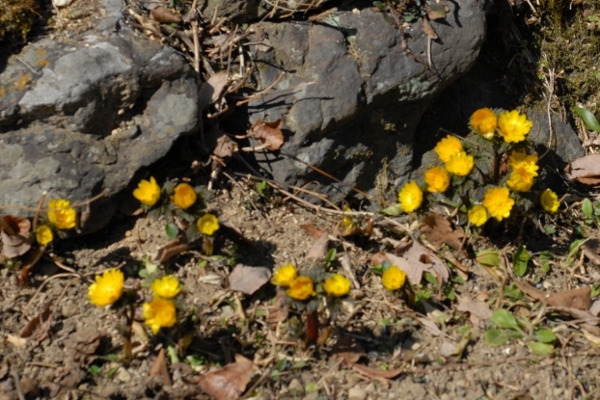 駅のホームで線路の向こうにフクジュソウを見つけたので撮影したかったが、電車が来てしまったのであきらめた。