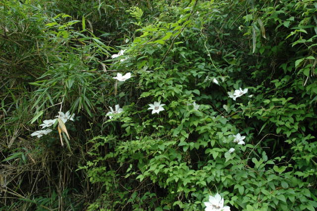 戻る途中、白い花が遠くに見えたので念のため近づいて確認してみると、それはガマズミだったけどその近くであまり目立たない感じで2株ほどカザグルマが咲いていた。