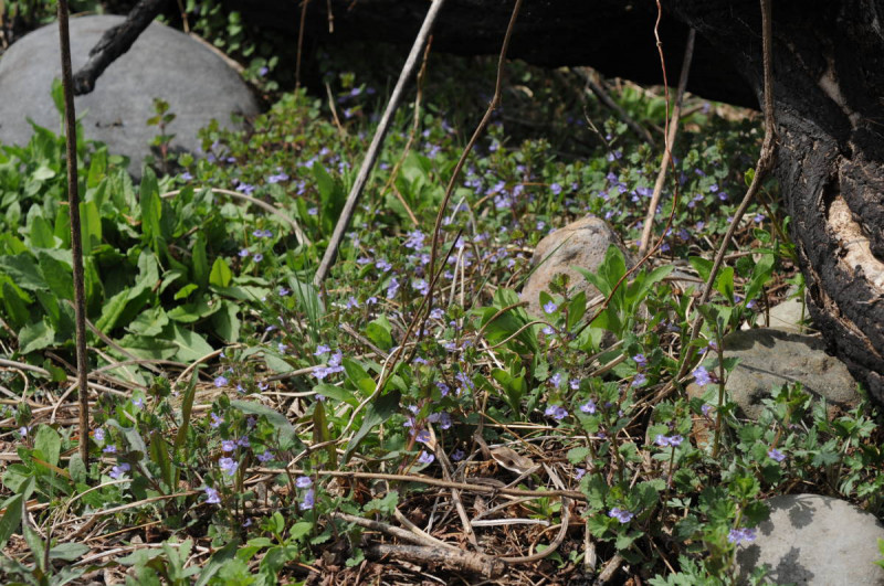 堤防の上はナズナやオオイヌノフグリ、ヒメオドリコソウなど春の雑草が咲きほこる。