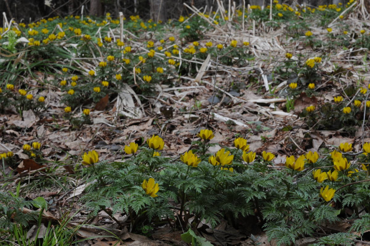 田沢湖に寄って辰子像を見た後、打当温泉またぎの湯へ行く途中、フクジュソウが群生していたので写真を撮った。ミチノクフクジュソウかもしれない。