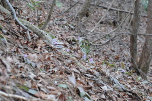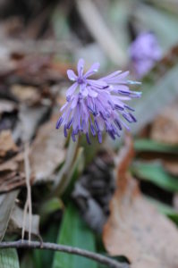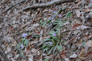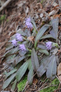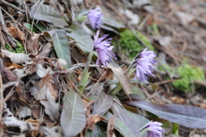 急斜面の落葉樹林の下に点々とショウジョウバカマが咲いていた。
