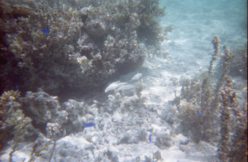 | 浜に出ると真っ白な砂浜が目に飛び込んでくる。コンドイビーチは真っ白な砂浜が広がる絵に 描いたようなビーチだ。売店やトイレもある。 とりあえず砂浜にビーチハウスを立てると水着に着替え、シュノーケルとゴーグルを 付けて海に入った。遠浅の海で岩が出ているので裸足で歩くと泳げる深さまで歩くのが大変だった。 なんとか泳げそうな深さのところまで歩いてばしゃばしゃ泳いで使い捨ての水中カメラで写真を撮った。 泳ぎ疲れるとビーチハウスに戻りのんびりと過ごした。 |