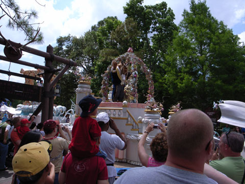 前日来たマジックキングダムのゲートの前に到着し中に入ると、日本とは違い昔のアメリカ風の落ち着いた建物が建ち並び、白馬の馬車なんかが走っている。