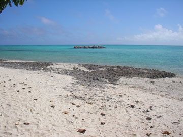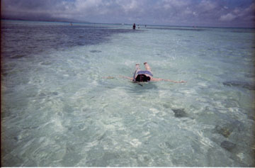 | 浜に出ると真っ白な砂浜が目に飛び込んでくる。コンドイビーチは真っ白な砂浜が広がる絵に 描いたようなビーチだ。売店やトイレもある。 とりあえず砂浜にビーチハウスを立てると水着に着替え、シュノーケルとゴーグルを 付けて海に入った。遠浅の海で岩が出ているので裸足で歩くと泳げる深さまで歩くのが大変だった。 なんとか泳げそうな深さのところまで歩いてばしゃばしゃ泳いで使い捨ての水中カメラで写真を撮った。 泳ぎ疲れるとビーチハウスに戻りのんびりと過ごした。 |