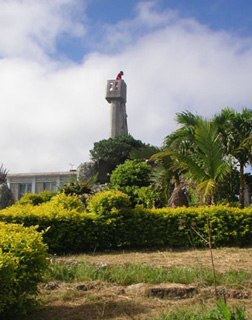 | 途中「なごみの塔」というところに寄った。なごみの塔は見張り台のようなところで 上は狭く一度に2,3人しか登れないので先客が降りるのを待ってから登った。 登ると竹富の集落が一望でき何枚か写真を撮った。 船着き場まで歩くと帰りの最終の船にちょうど良い時間で15分ほどで船が来て、 それに乗って石垣へ帰った。 一旦ホテルに戻りおみやげの買い物と晩飯に出かけた。 商店街で、ちんすこうやパイナップルなんかを買って、初日と同じ店で石垣牛の 一口ステーキを食べた。 食事の後もまだ開いているおみやげ屋があったので入り、しーさーの置物なんかを買った。 |